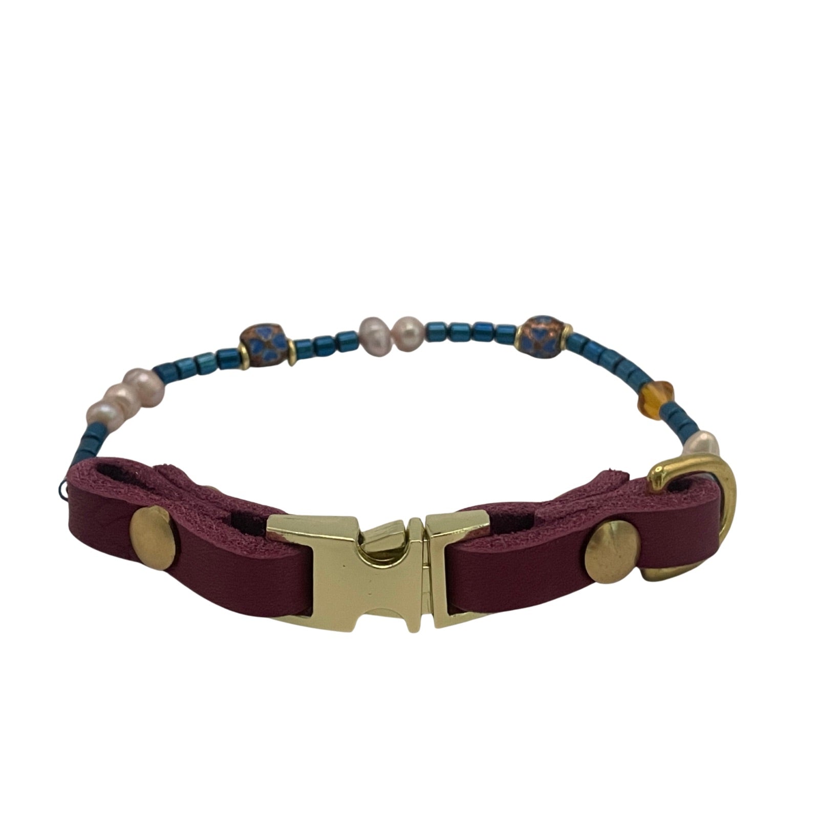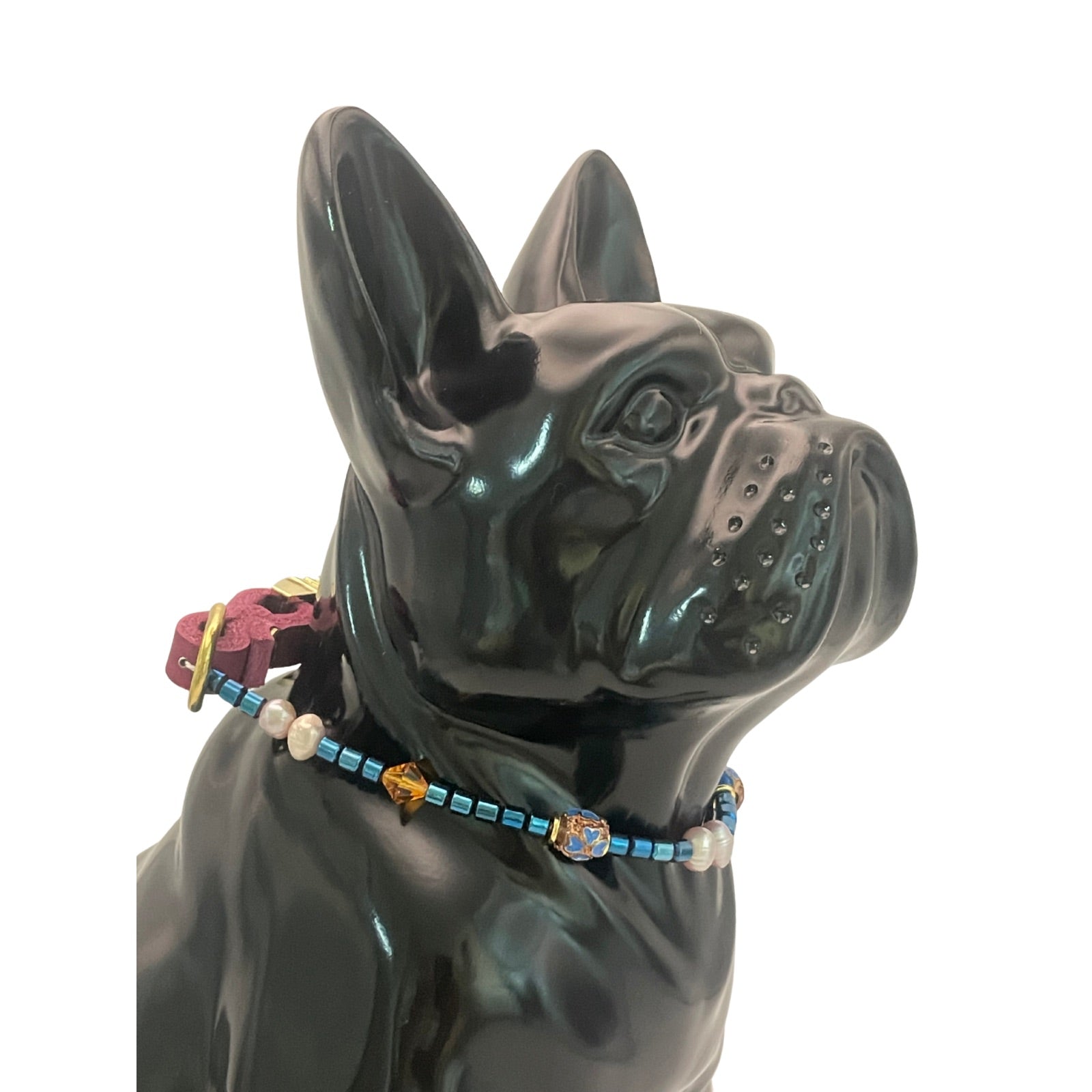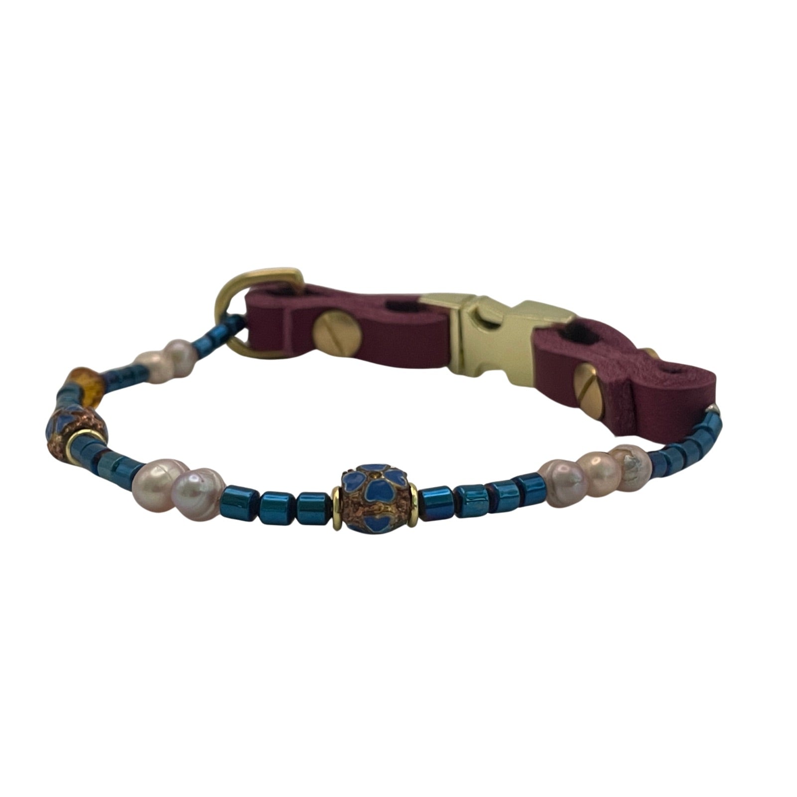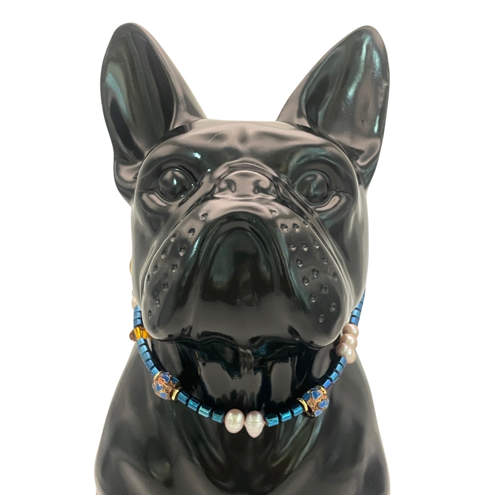Dieses fein gearbeitete Einzelstück vereint ausgewählte Materialien zu einem einzigartigen Schmuckstück für deinen Hund. Der schimmernde blau beschichtete HÄMATIT verleiht der Kette moderne Eleganz, während echte SÜßWASSERPERLEN für einen natürlichen, luxuriösen Akzent sorgen.