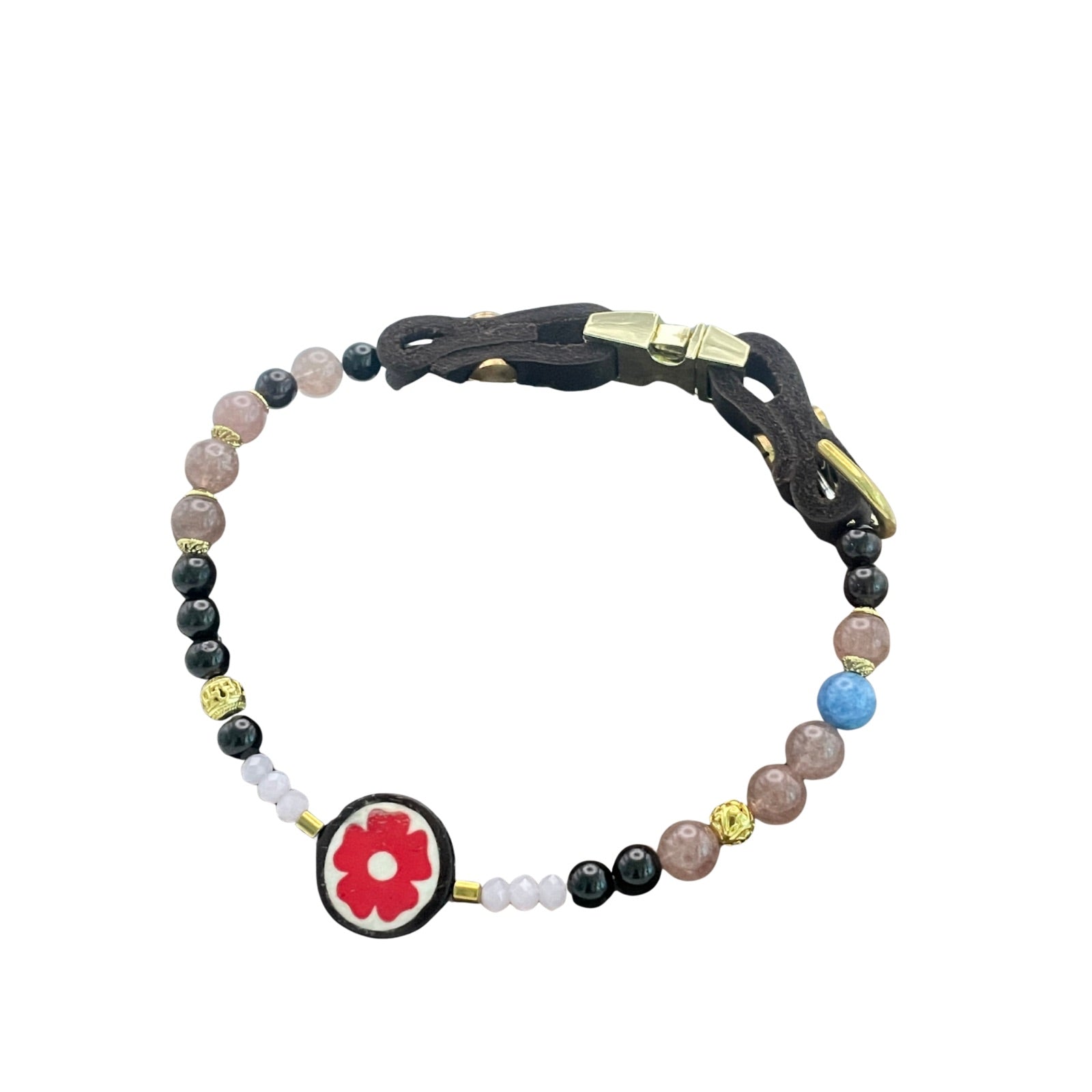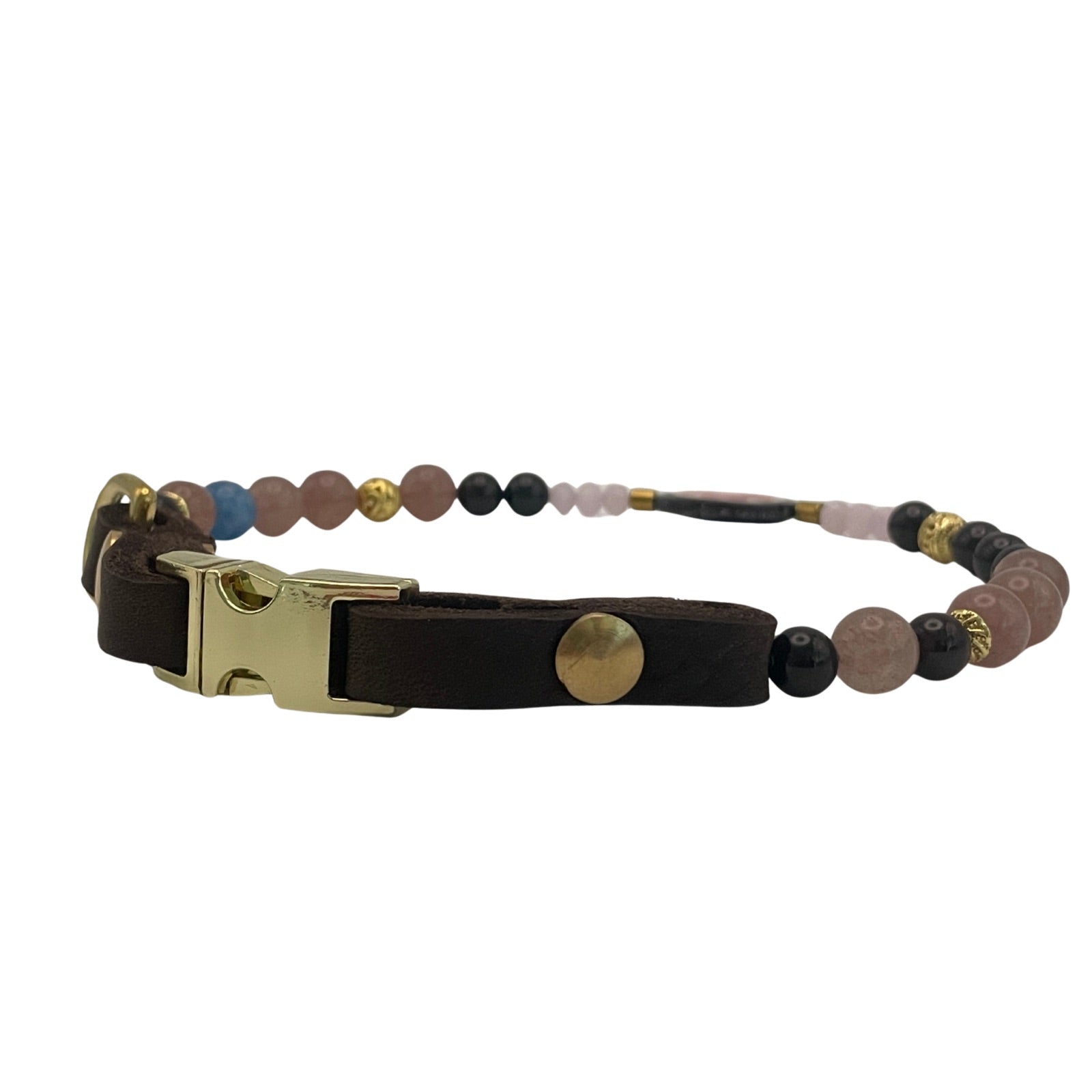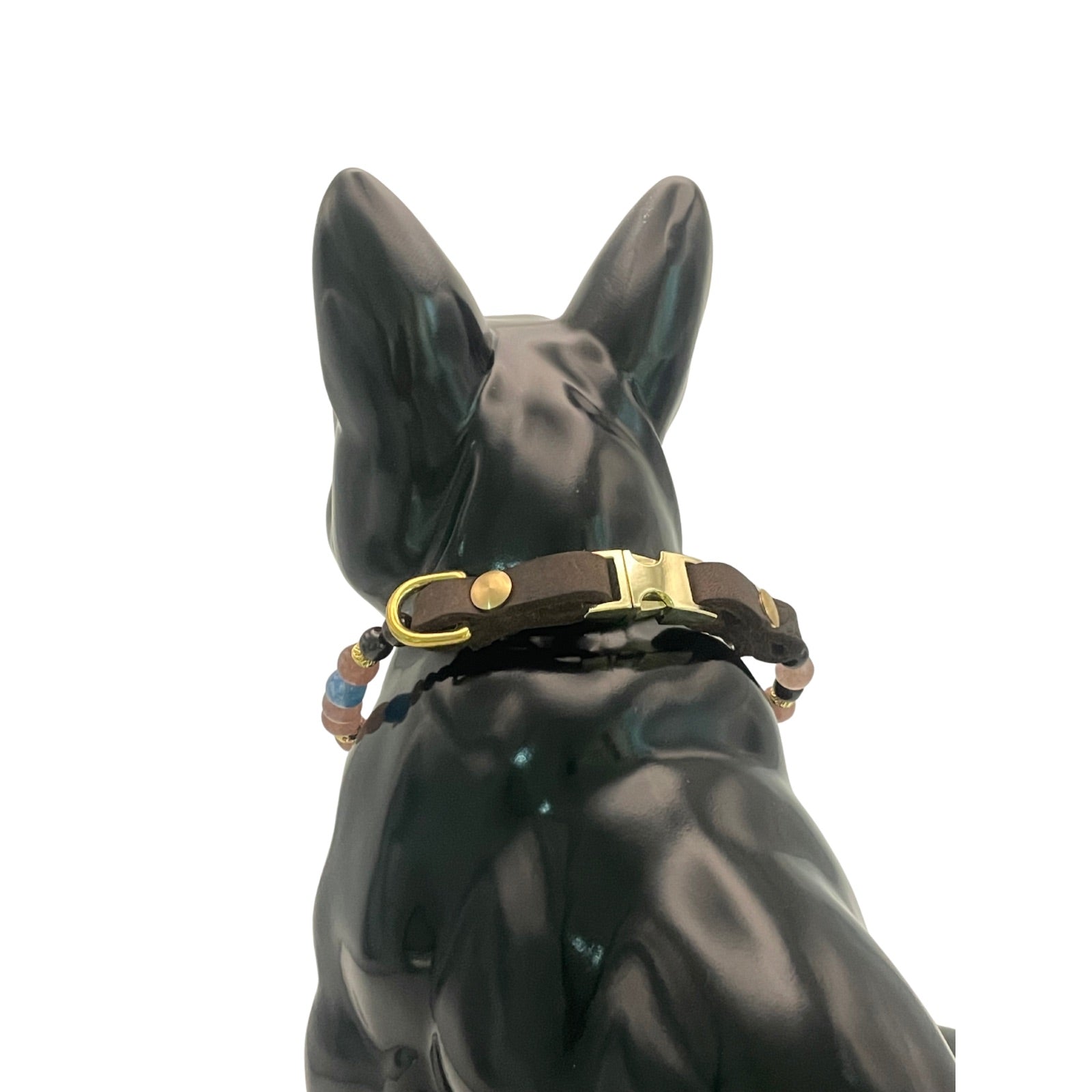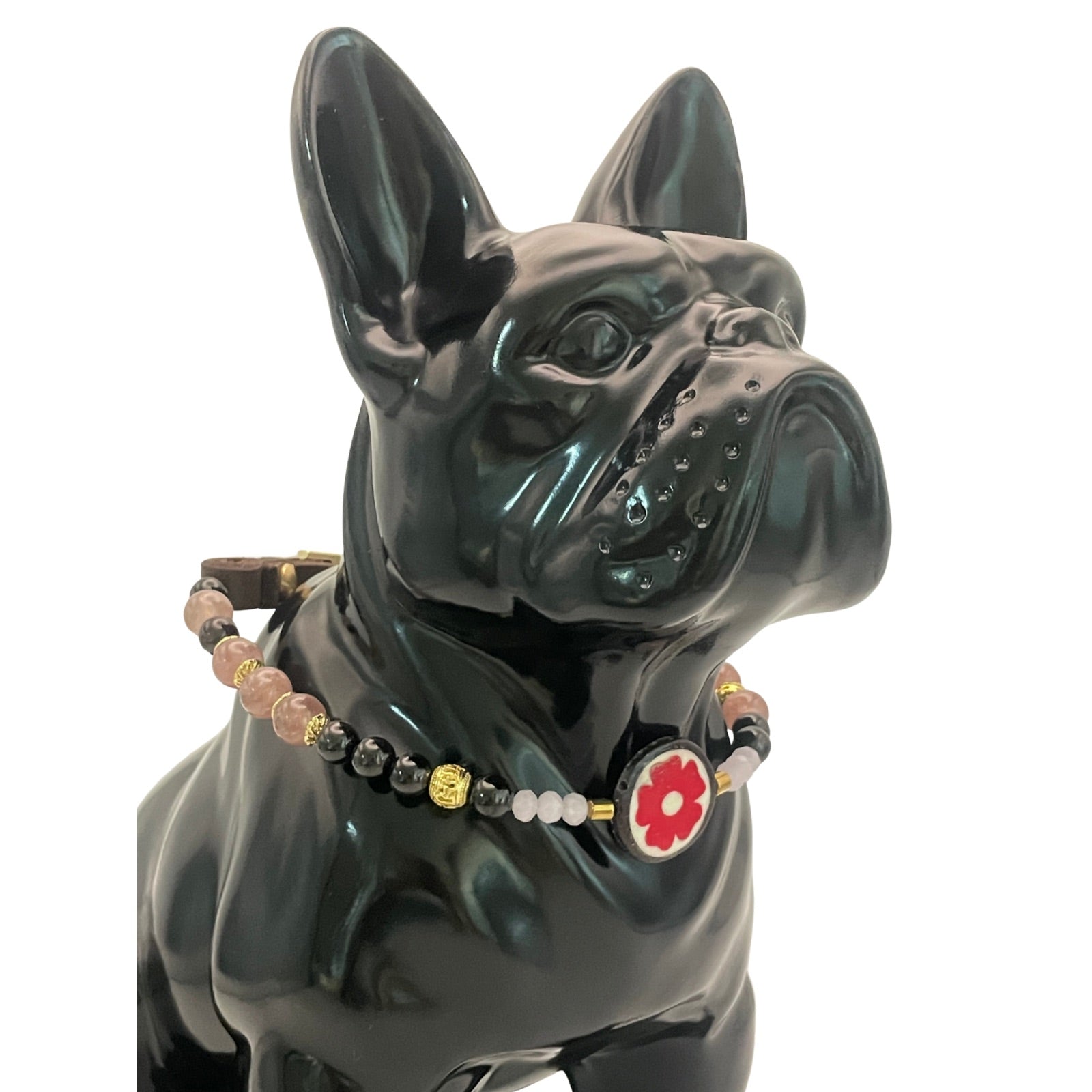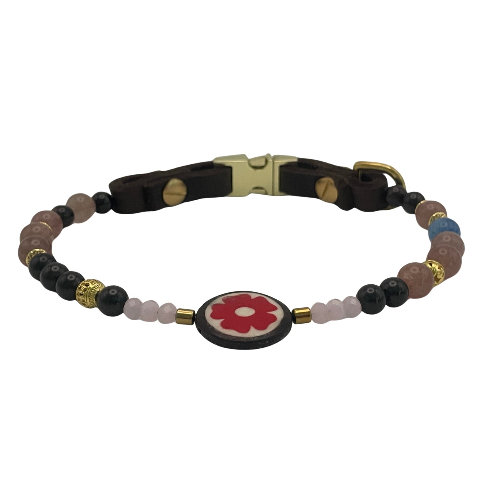 Dieses exklusive Hundehalsband vereint hochwertige Edelsteine mit einem kunstvollen Detail aus Naturhorn: Eine handgearbeitete Knochenperle mit floralem Muster bildet das Herzstück und verleiht dem Design eine besondere Symbolkraft.