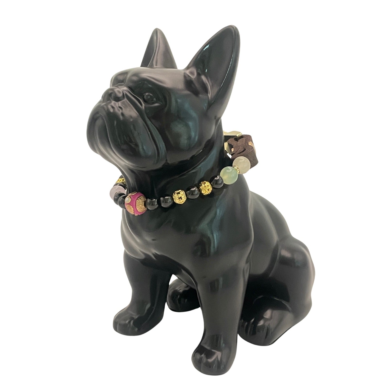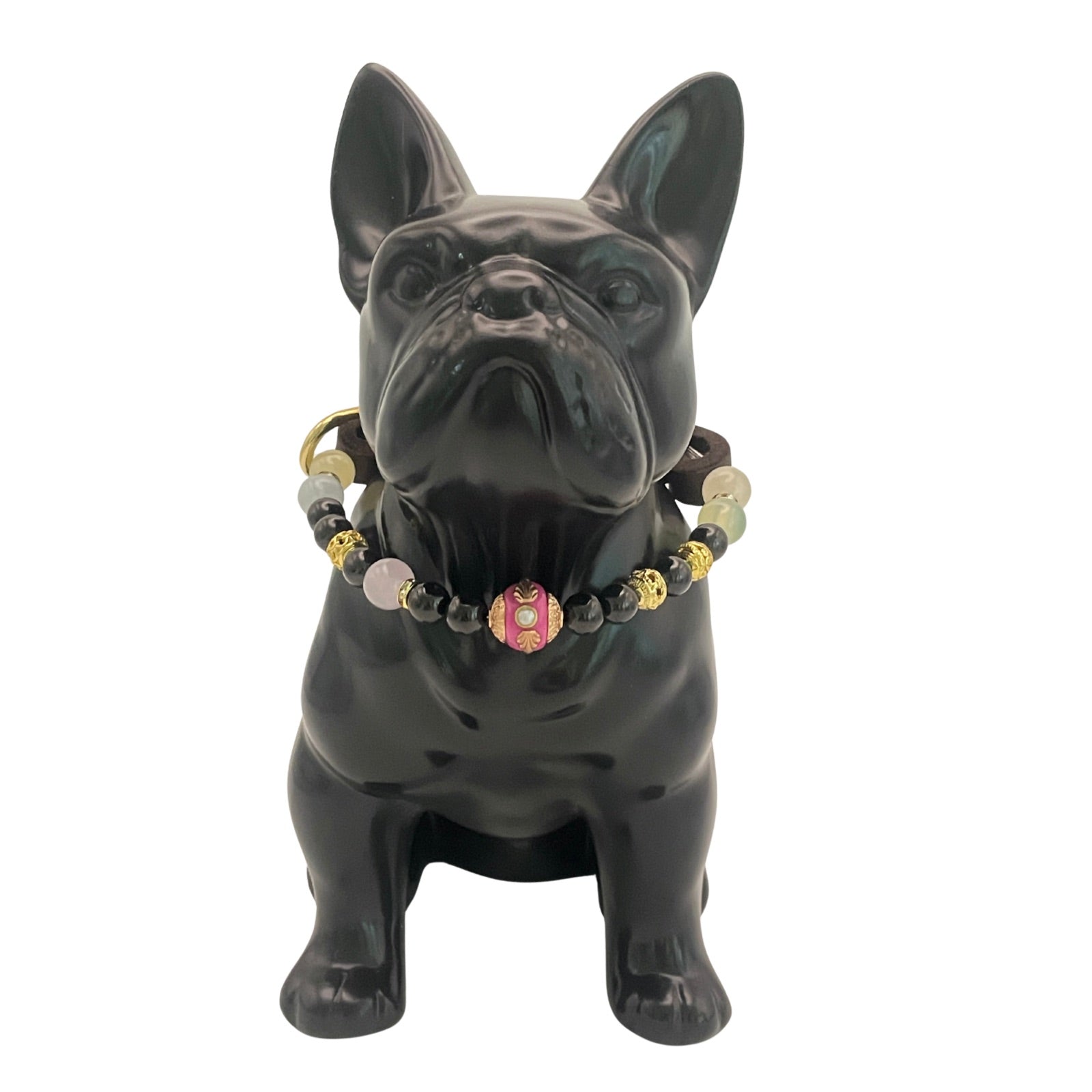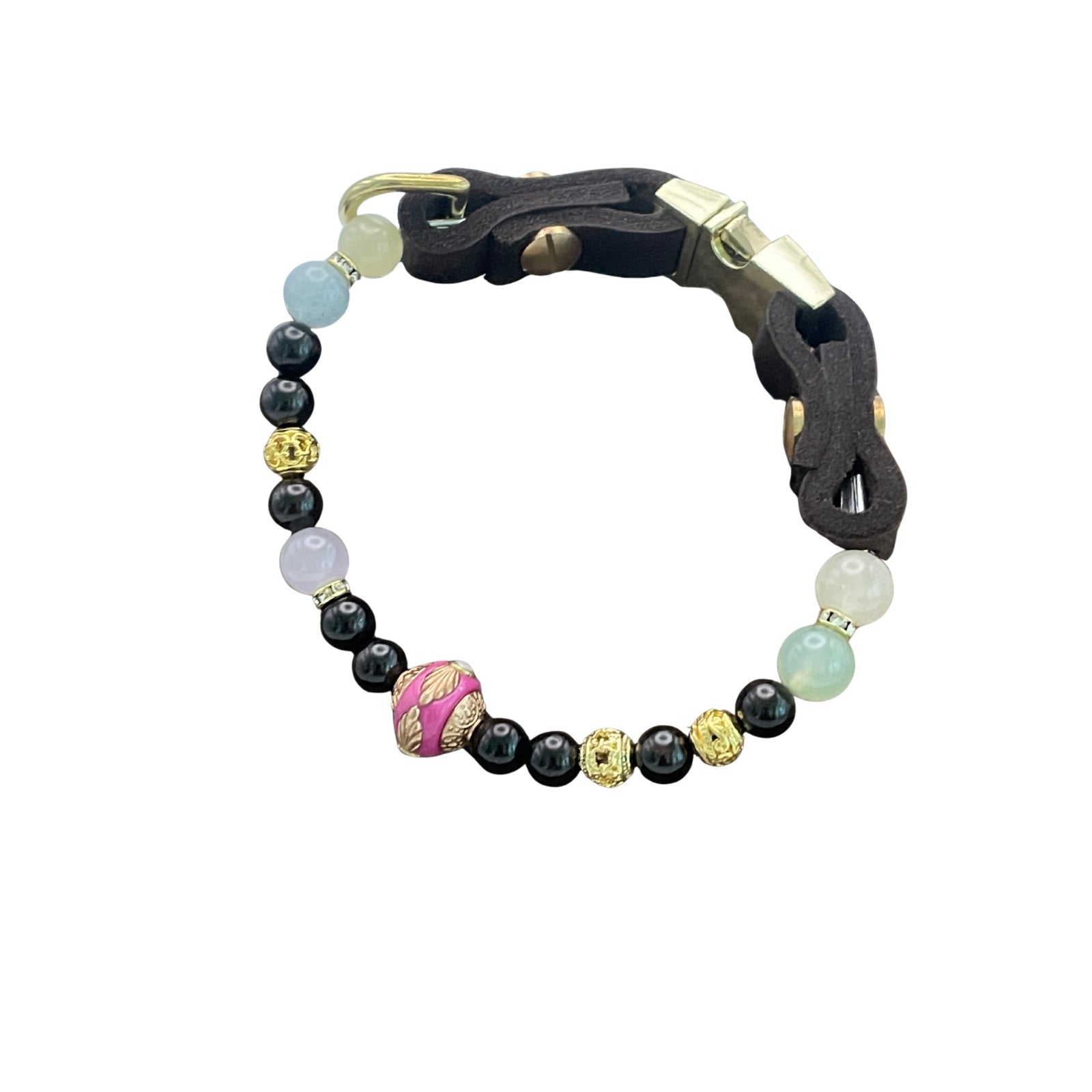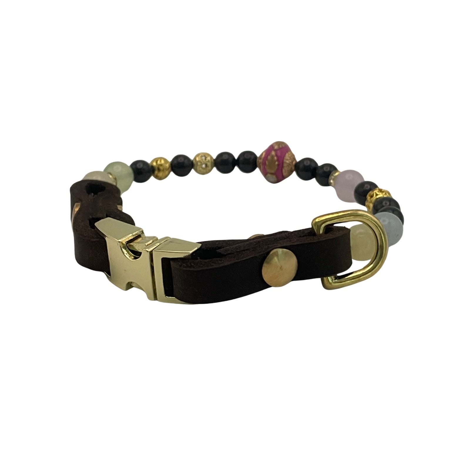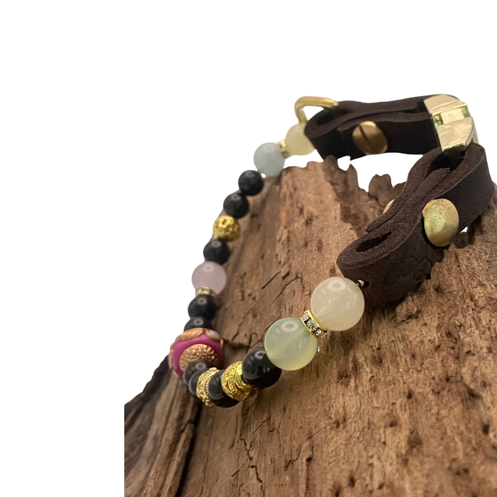 Dieses Halsband kombiniert tiefe Schutzenergien mit einer femininen Mitte: Eine kunstvolle rosa-goldene Schmuckperle bildet den Blickfang und wird umrahmt von edlen Natursteinen und feinen vergoldeten (Goldauflage) Zwischenelementen.