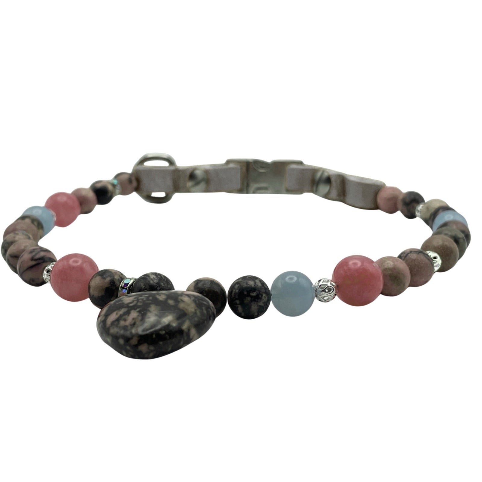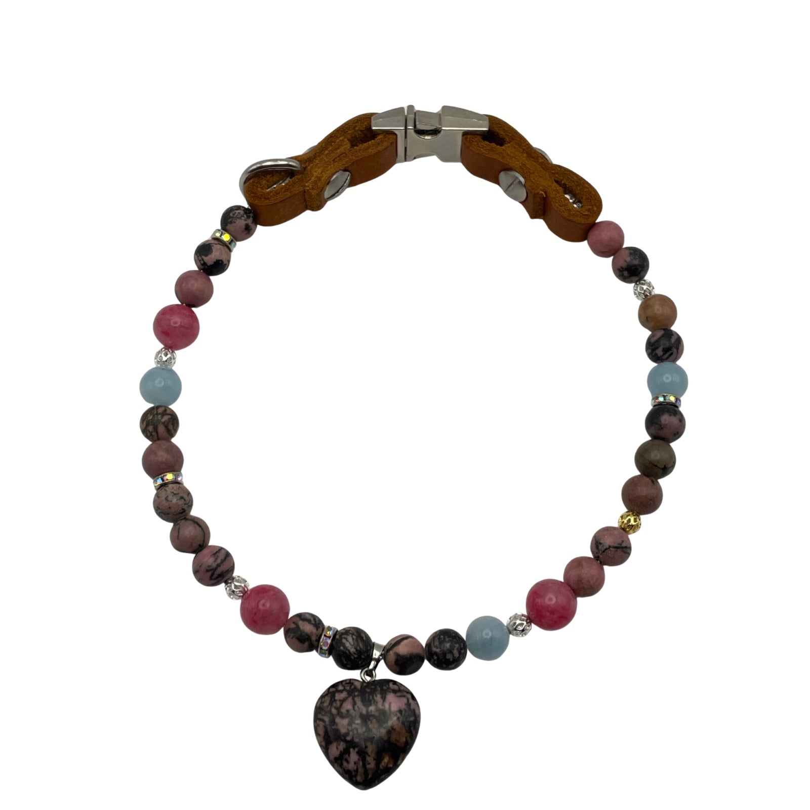 Ein edles Schmuckstück für besondere Hunde: Dieses liebevoll handgefertigte Halsband vereint hochwertige Edelsteine in sanften Rosa- und Blautönen mit einem eindrucksvollen Rhodonit-Herzanhänger..