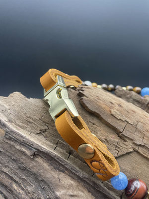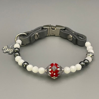 Echte Edelsteine, hochwertige Zwischenteile und feine Lederriemen vereinen sich zu einem Design, das die Einzigartigkeit deines Hundes unterstreicht.